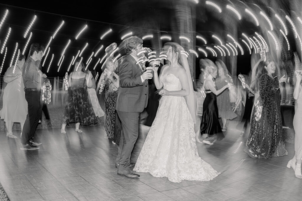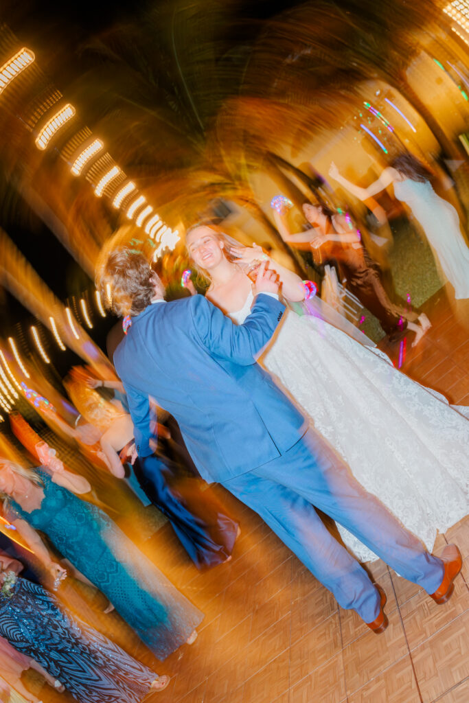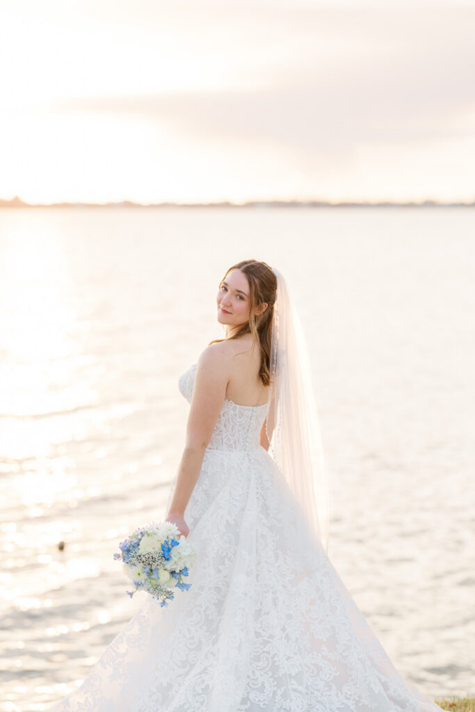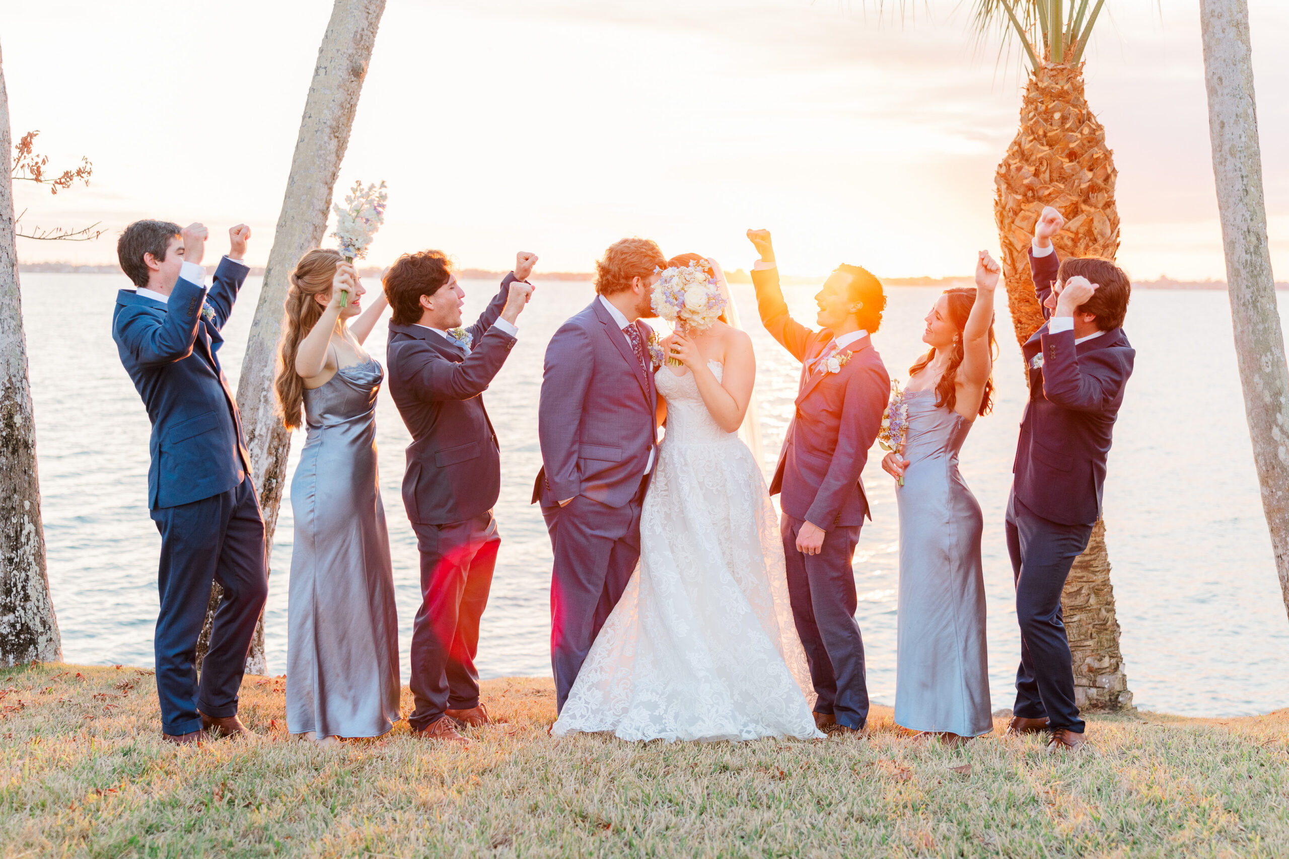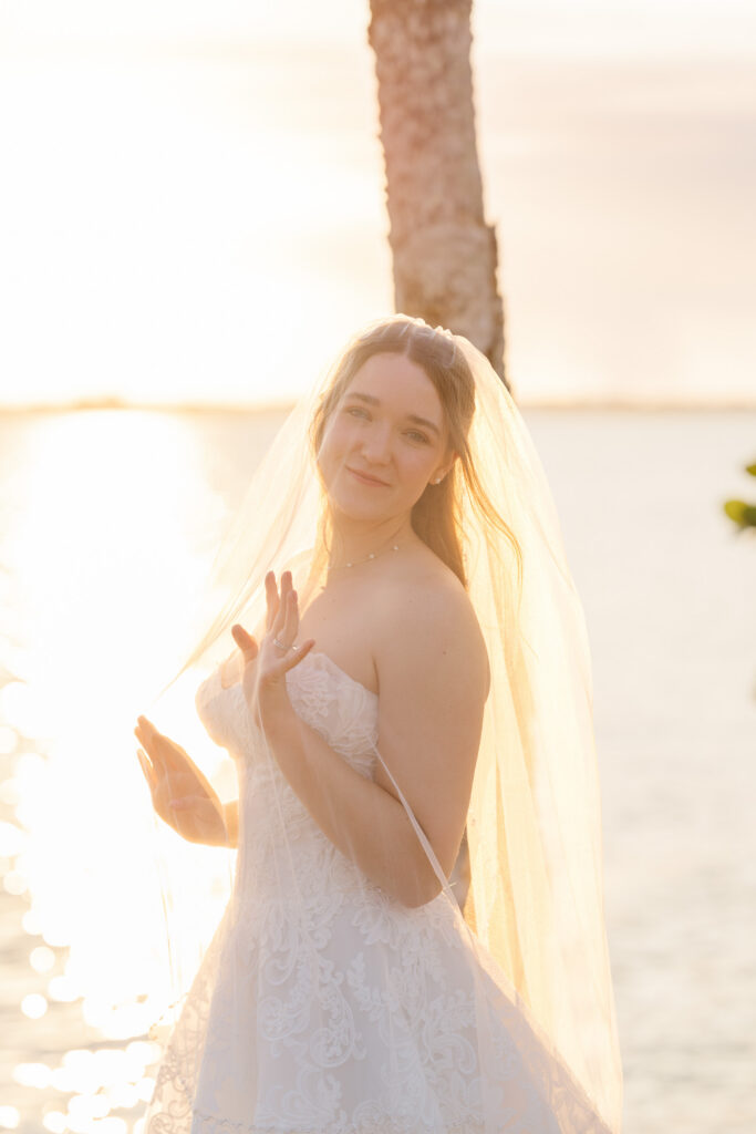 After the ceremony, we stepped down to the Indian River for portraits and were gifted the most unreal sunset. The sky glowed. The water reflected everything. Maya and Austin were full of post wedding energy. You can really see in the photos how happy they were that day.