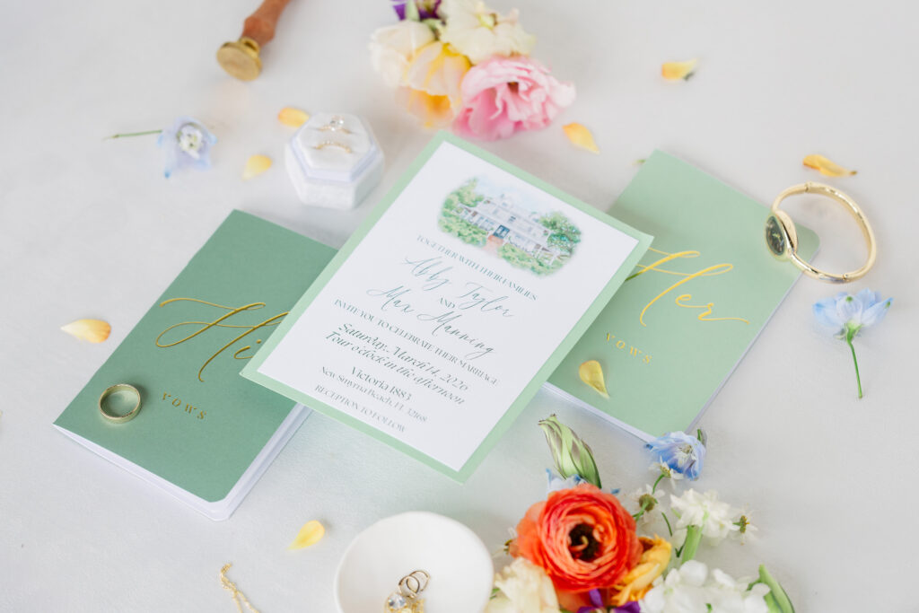 Her invitation suite featured a custom illustration of the venue paired with soft sage tones, tying the entire design together in a way that felt – just right.