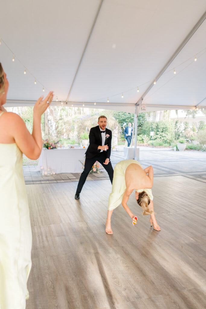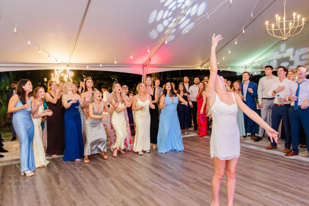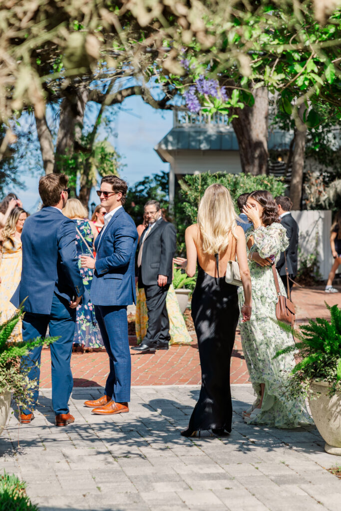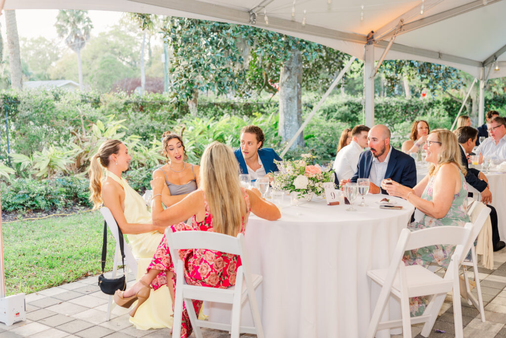 As the evening began, guests gathered outside of the reception area where a tented reception space had been set. Everyone was enjoying cocktails among the beautiful greenery. Everyone was dressed in their best and the colors were popping.