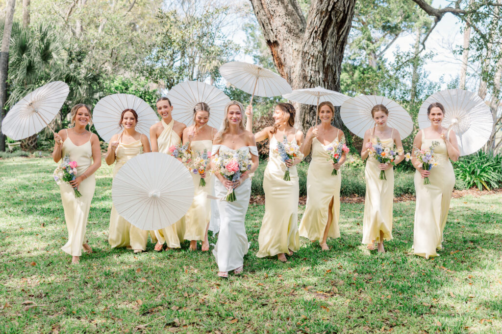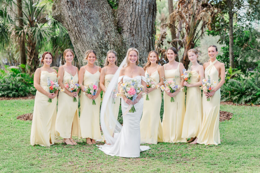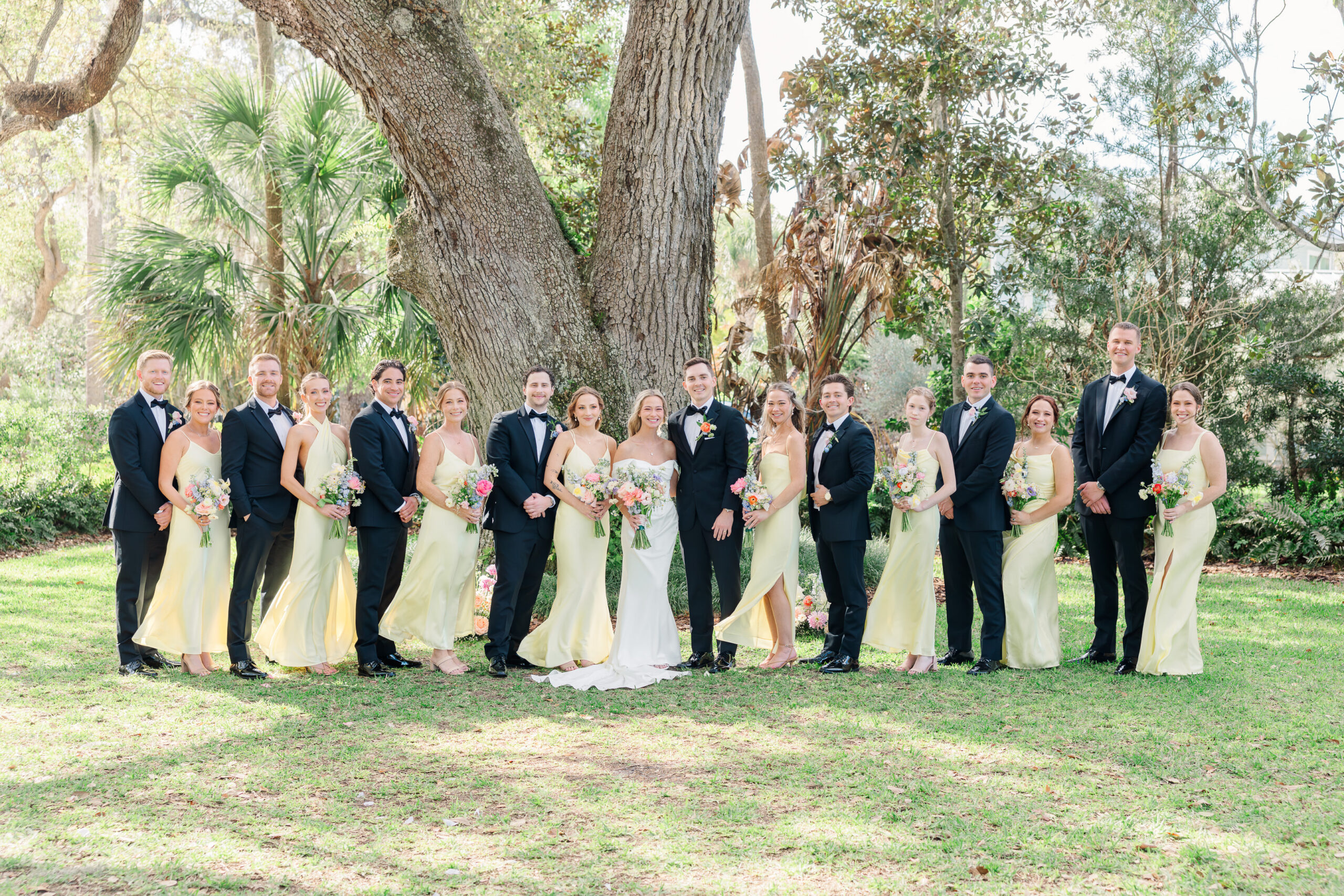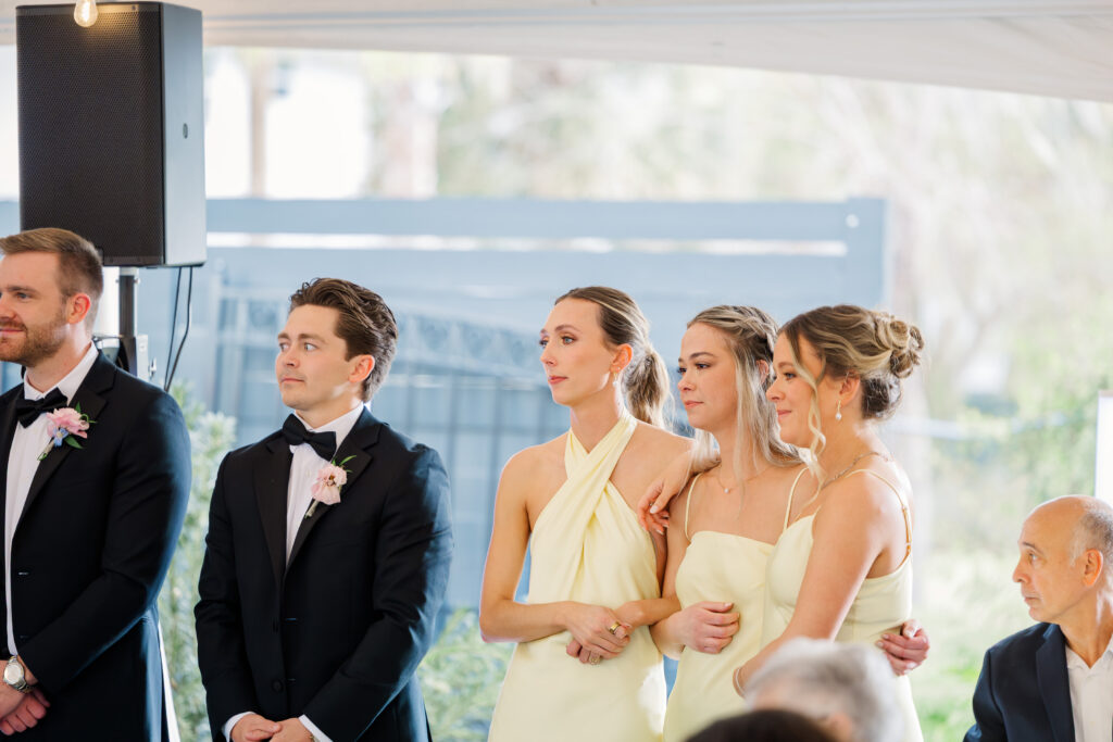 The bridesmaids wore pale butter yellow silk dresses that looked incredible in the sunlight, while the groomsmen wore classic black tie attire, creating a clean and balanced aesthetic.